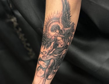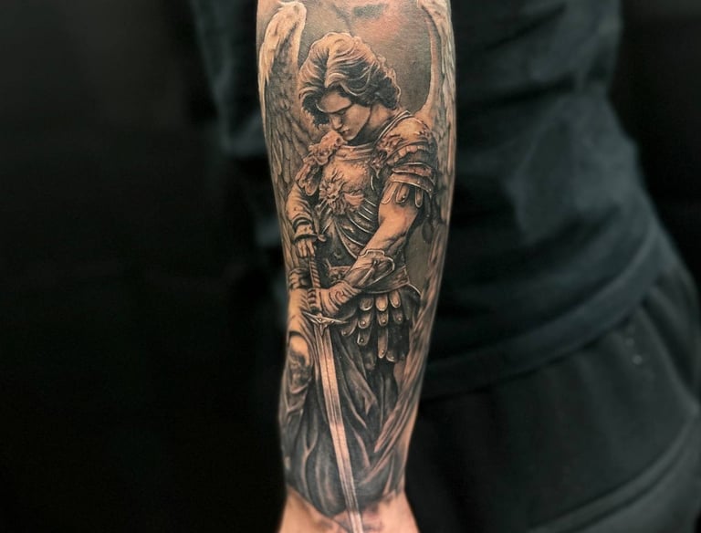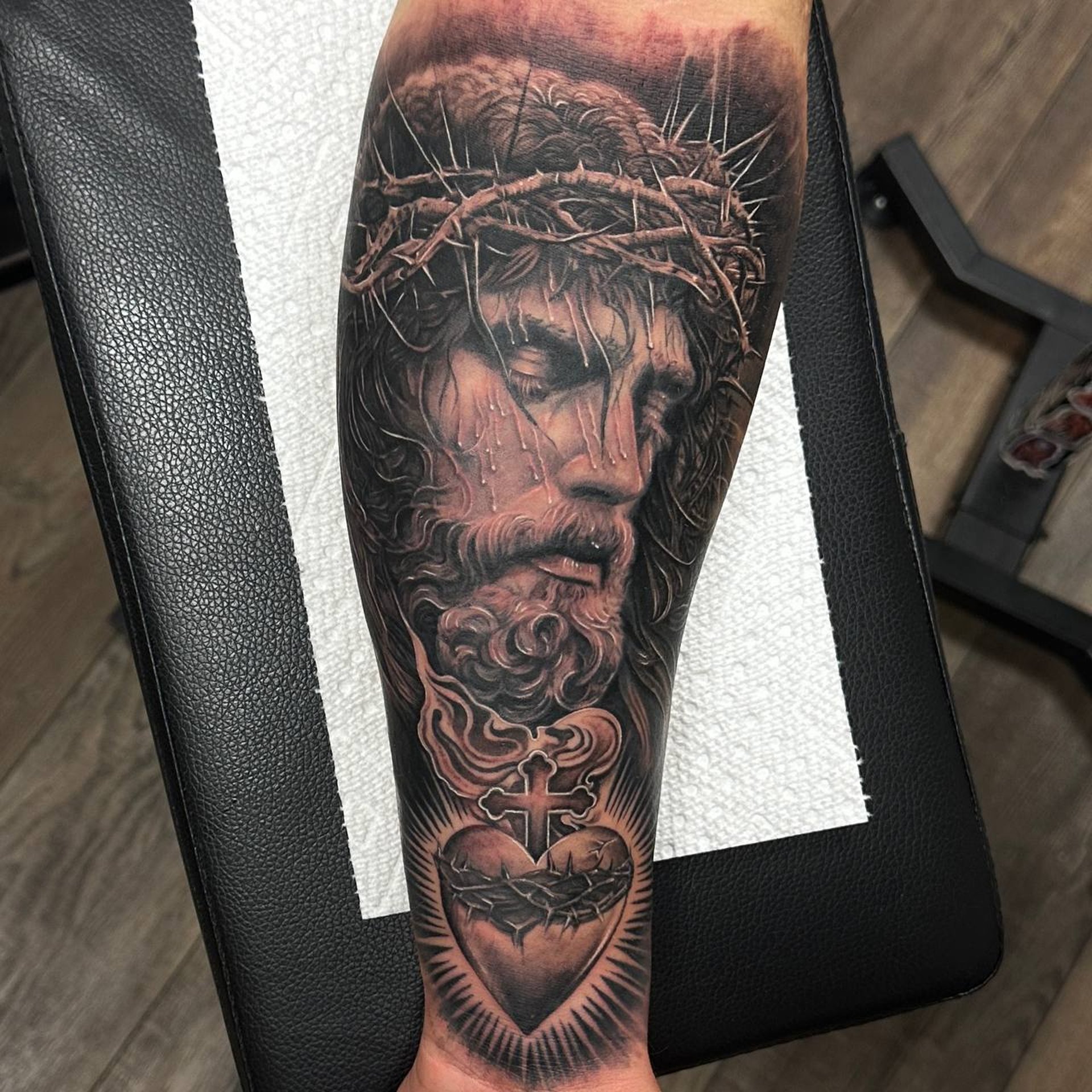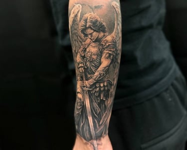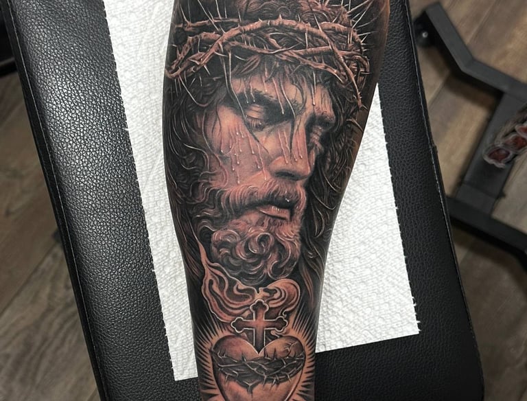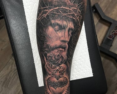 Where shadows tell stories. Specializing in photorealistic portraits, religious iconography, and custom sleeve work that commands attention.